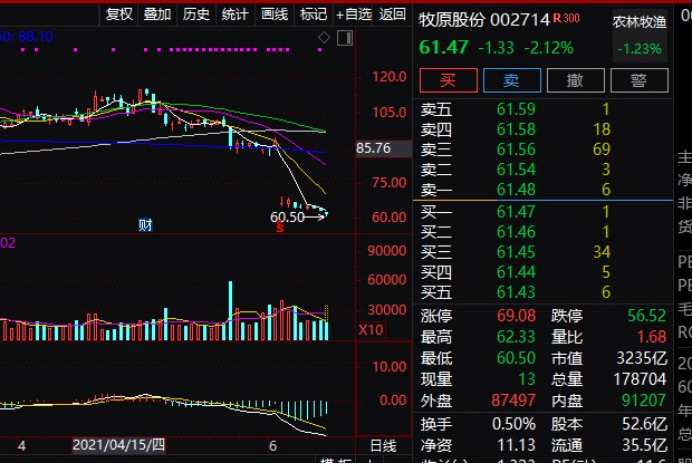 養(yǎng)豬龍頭【牧原股份(002714)、股吧】(002714,股吧)走勢相對堅(jiān)挺,盤中一度下跌超過3%,但其后跌勢有所收窄,上午收盤時(shí)下跌2.12%。