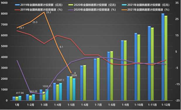 圖2 前5個(gè)月全國(guó)鐵路投資及增速
