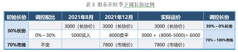 模擬案例4:班輪公司B采用“30%長(zhǎng)協(xié)+70%市場(chǎng)”相結(jié)合的方式,以$3000/TEU的均價(jià)簽訂了亞歐航線(xiàn)長(zhǎng)協(xié)合同。由于運(yùn)價(jià)大幅上漲,班輪公司B的長(zhǎng)協(xié)價(jià)已遠(yuǎn)低于市場(chǎng)價(jià),隨即采用集裝箱運(yùn)價(jià)期貨降低長(zhǎng)協(xié)比例,提升市場(chǎng)比例,實(shí)現(xiàn)更高的運(yùn)費(fèi)收益。