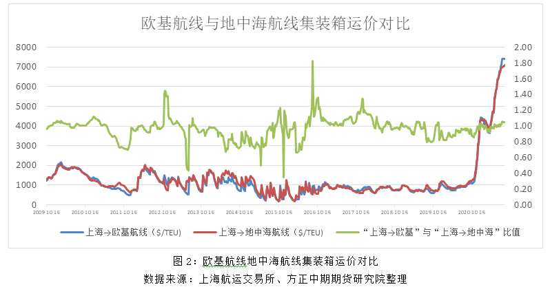 第三,“中國(guó)至北歐”與“中國(guó)至地中?!钡倪\(yùn)價(jià)也有極高相似度和趨同性。對(duì)比上海航運(yùn)交易所的SCFI上海→歐基和上?!刂泻蓷l航線(xiàn)的最近12年數(shù)據(jù)可以看出,兩條航線(xiàn)的相關(guān)系數(shù)達(dá)到99.2%,上海→歐基/上?!刂泻_\(yùn)價(jià)的平均比值為0.97。因此,“中國(guó)→歐洲五大基本港”可以進(jìn)一步延伸至“中國(guó)→北歐/地中?!?。