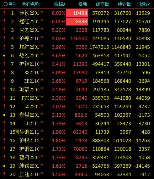 8月30日,期市早盤大面積飄紅。錳硅、硅鐵主力合約漲停,尿素主力合約漲超5%,滬鎳主力合約漲超4%,螺紋、熱卷、滬鋁、不銹鋼主力合約漲超3%。跌幅方面,生豬、大豆主力合約跌超2%。