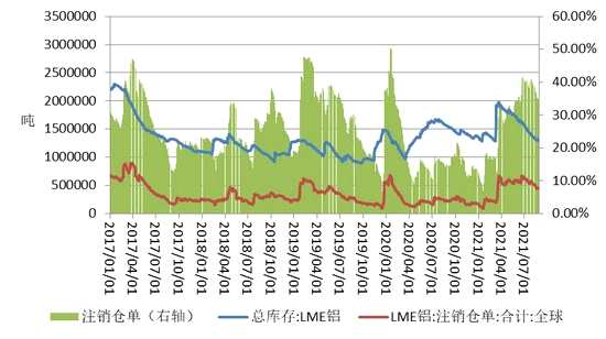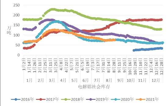 截至2021年8月27日,LME鋁庫存為1338125噸,較7月減少49675噸,或-3.58%。2020年同期庫存為1554375噸。8月庫存水平處于5年同期的第2高位。