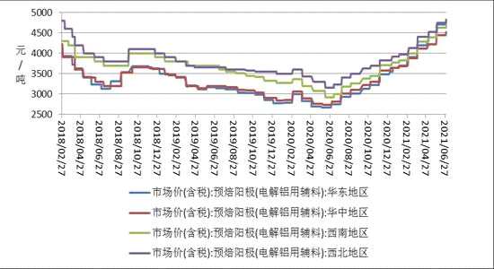 8月,預(yù)焙陽極均價為4759.72元/噸,較7月上漲43.30元/噸,或0.92%,波動范圍:4525~4875。2020年同期預(yù)焙陽極均價為3129.02元/噸。8月預(yù)焙陽極均價處于5年同期的最高位。