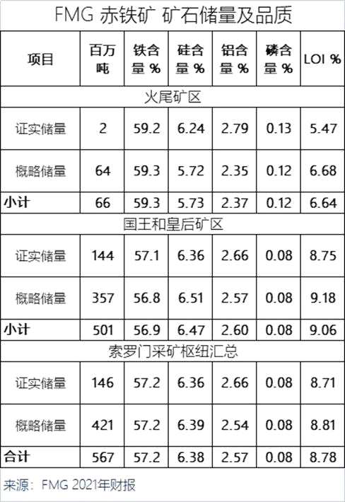通過FMG2021財年報顯示,截至 2021 年 6 月 30 日,包括礦山的礦石和產(chǎn)品庫存,港口的產(chǎn)品庫存已被排除在礦石儲量之外。索羅門采礦樞紐(Solomon Hub)的礦石儲量估計為 5.67億噸,平均鐵品位為 57.2%;索羅門采礦樞紐(Solomon Hub)礦產(chǎn)資源總量估計為19.34億噸,平均鐵品位為 55.2%,其中 69% 屬于測量和指示礦產(chǎn)資源類別。