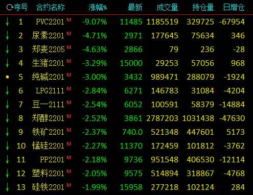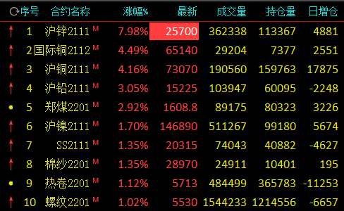 10月14日期市早盤收盤,有色金屬漲幅擴大,能化商品領(lǐng)跌。滬鋅封漲停,收漲7.98%,國際銅、滬銅漲超4%,滬鉛漲超3%;跌幅方面,PVC跌超9%,尿素跌超4%,生豬主力合約跌超3%。