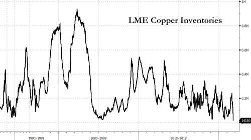 LME的數(shù)據(jù)顯示,LME銅庫(kù)存注冊(cè)倉(cāng)單已從一個(gè)月前的逾15萬(wàn)噸,大幅下降至了上周五的僅1.4150萬(wàn)噸,為1998年以來(lái)最低,在短短一個(gè)月內(nèi)的降幅高達(dá)逾90%。庫(kù)存的銳減直接推動(dòng)了銅價(jià)的走高,LME期銅價(jià)格自本月初以來(lái)上漲了約13%,逼近5月份創(chuàng)下的紀(jì)錄高位。