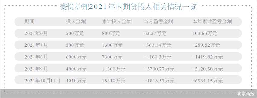 巨虧后,10月24日晚間豪悅護理也提到,公司全體董事、監(jiān)事、高級管理人員對由期貨投資產生的虧損深表歉意,公司對主要責任人進行警告和降薪處理。本著勤勉盡責、對投資者負責的態(tài)度,高度重視期貨投資的潛在風險,將盡快有序終止期貨操作,對目前持倉謹慎決策擇機進行減倉、平倉,盡量減少期貨投資虧損,并注銷期貨賬戶,后續(xù)專心主營業(yè)務。