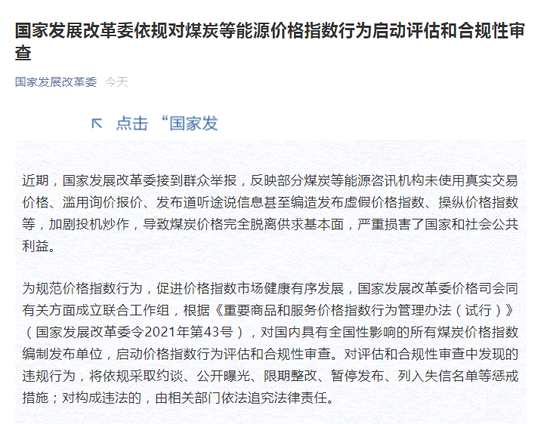發(fā)改委:國家發(fā)展改革委依規(guī)對煤炭等能源價格指數(shù)行為啟動評估和合規(guī)性審查