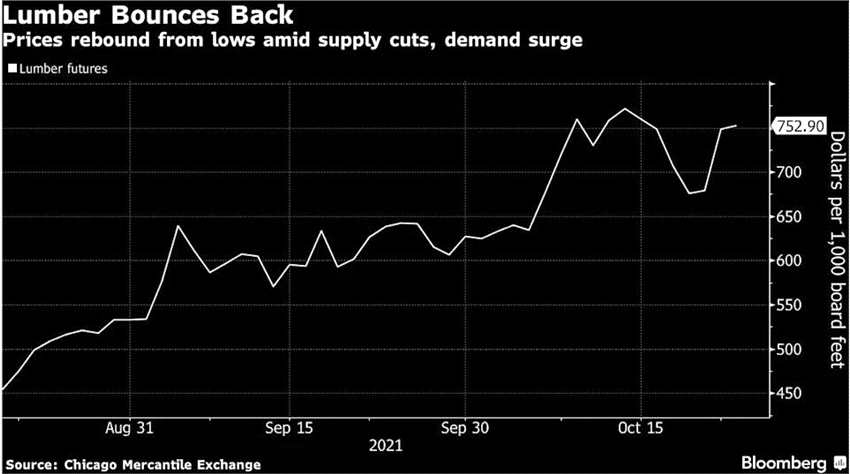 由于供應(yīng)緊張和住房建設(shè)回暖,木材價(jià)格近期正重新攀升。加拿大西部的產(chǎn)出正在減少,美國南部的主要產(chǎn)區(qū)則正在努力解決勞動(dòng)力短缺的問題。此外,預(yù)計(jì)美國下個(gè)月還將對加拿大一種普通木材征收雙倍關(guān)稅,這將進(jìn)一步增加成本。