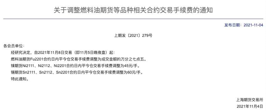 11月4日,上期所公告,經(jīng)研究決定,自2021年11月8日交易(即11月5日晚夜盤(pán))起,燃料油期貨Fu2201合約日內(nèi)平今倉(cāng)交易手續(xù)費(fèi)調(diào)整為成交金額的萬(wàn)分之七點(diǎn)五;鎳期貨Ni2111、Ni2112、Ni2201合約日內(nèi)平今倉(cāng)交易手續(xù)費(fèi)調(diào)整為45元/手;錫期貨Sn2111、Sn2112、Sn2201合約日內(nèi)平今倉(cāng)交易手續(xù)費(fèi)調(diào)整為60元/手。