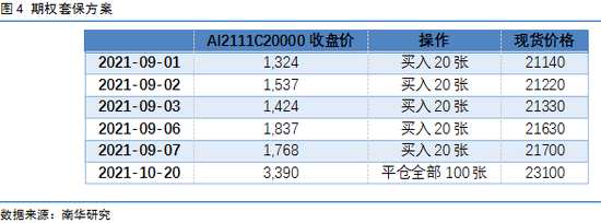 根據傳統(tǒng)的期貨套保方案,我們?yōu)榱吮苊赓徣氍F貨成本的增加,選擇在期貨端進行買入鋁期貨頭寸的操作。由于假設需要對500噸鋁進行套保,在盤面一共需要買入100手鋁期貨頭寸。我們選擇滬鋁2111合約,在5天時間內分批建倉套保頭寸,每次建倉20手。當10月19日,國家相關部門開始對煤炭行業(yè)價格開始調控,次日,我們選擇對持有的鋁期貨多頭頭寸進行平倉。