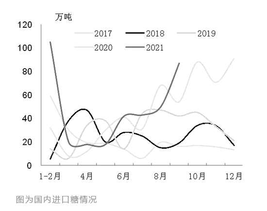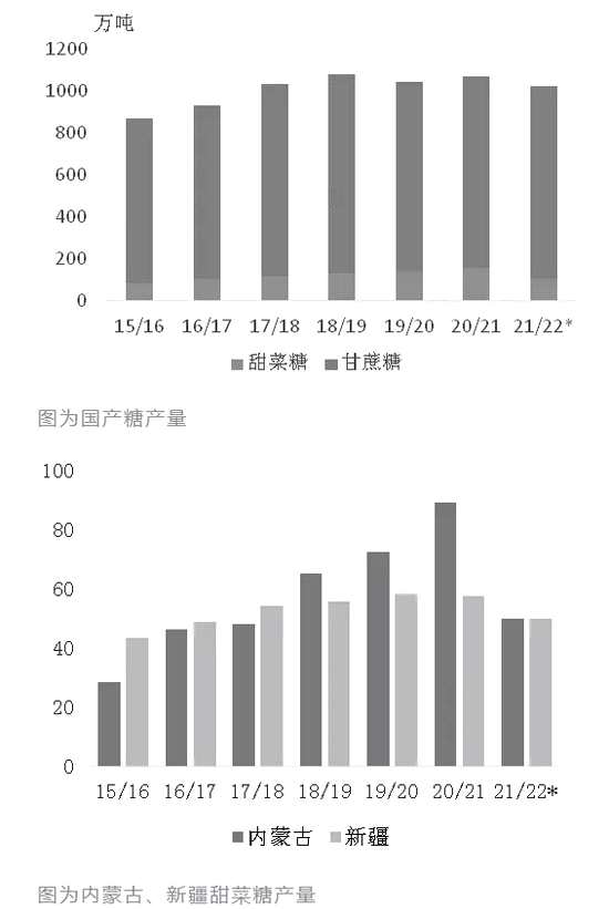 新榨季國產(chǎn)糖成本增加板上釘釘。新榨季甜菜收購價未有明顯變化,但甜菜糖成本大幅增加。一是甜菜產(chǎn)量大降令噸糖成本驟增。新榨季內(nèi)蒙古僅個別糖廠產(chǎn)量接近上榨季,絕大部分糖廠產(chǎn)量大幅下降,還有糖廠因甜菜數(shù)量過少而關(guān)停,且新糖廠多數(shù)在2017年以后建成,折舊成本高。二是甜菜糖廠生產(chǎn)過程中的能耗以煤炭為主,能源價格飆漲明顯增加甜菜糖生產(chǎn)成本,同時輔助材料價格上漲也令甜菜糖生產(chǎn)成本小幅增加。同時,新榨季甘蔗糖不同產(chǎn)區(qū)成本也出現(xiàn)不同程度的上漲。甘蔗價格穩(wěn)中有升,廣東甘蔗收購價由上榨季的450元/噸增至480—490元/噸,廣西的搶蔗亂象也將一定程度增加甘蔗到廠成本,且甘蔗糖廠與甜菜糖廠一樣,無法規(guī)避輔助材料價格上漲的風(fēng)險。因此,北方甜菜糖廠和廣東糖廠成本增長最明顯,云南糖成為成本最低糖源,不同糖源、產(chǎn)區(qū)間的成本優(yōu)勢變化明顯。目前甜菜糖廠已全部開榨,糖報價高,其中內(nèi)蒙古報價已平水甚至升水SR2201合約,甜菜糖廠挺價惜售意愿強烈。廣西部分集團新糖預(yù)售價貼水SR2201合約100元/噸左右,實行賣方點價,點價期限為今年12月底之前,報價不低。