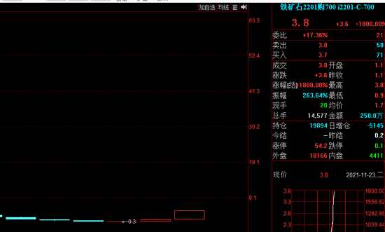 鐵礦石2201合約行權(quán)價(jià)在700元的看漲期權(quán),截至發(fā)稿報(bào)價(jià)3.8元,而在上周五,其盤(pán)中最低報(bào)價(jià)僅為0.3元。短短兩個(gè)交易日,漲幅超過(guò)1200%。