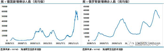 具體來看,全球新增病例達(dá)到72萬人,維持在相對高位,其中歐洲地區(qū)新增41萬人,處于疫情爆發(fā)以來的最高值區(qū)間,短期看增長的勢頭有所企穩(wěn)。但分國家來看,英國新增確診病例已經(jīng)開始突破9萬人/天,從其判斷情況來看奧密克戎在12月份將讓其確診規(guī)模高達(dá)20萬人/日,這是非??膳碌囊荒?,法國新增確診病例為6.5萬人/天,也處于較高的位置上。德國和俄羅斯最近新增確診人數(shù)有所下滑,德國為5.4萬人,俄羅斯為2.8萬人。
