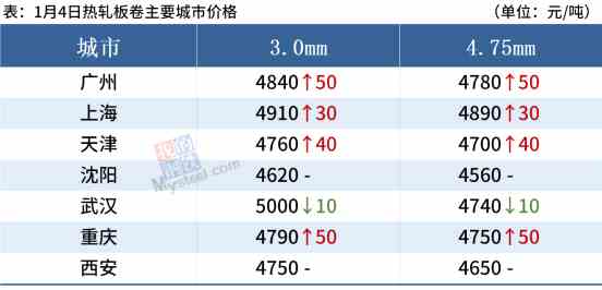 熱軋板卷:1月4日,全國(guó)24個(gè)主要城市4.75mm熱軋板卷均價(jià)4781元/噸,較上個(gè)交易日價(jià)格上漲3元/噸。今日黑色商品期貨市場(chǎng)震蕩上行,現(xiàn)貨市場(chǎng)價(jià)格小幅跟漲,但漲后成交一般,現(xiàn)貨市場(chǎng)暗降情況較多。目前市場(chǎng)實(shí)際需求仍然趨弱,臨近春節(jié),市場(chǎng)整體供需雙弱情況依舊繼續(xù)。綜合來(lái)看,節(jié)后市場(chǎng)大多持穩(wěn)觀望為主,價(jià)格下跌欲望不強(qiáng),冬儲(chǔ)意愿也較弱,預(yù)計(jì)5日價(jià)格或繼續(xù)弱穩(wěn)運(yùn)行為主。