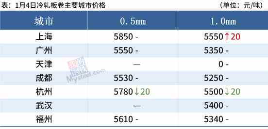 冷軋板卷:1月4日,全國(guó)24個(gè)主要城市1.0mm冷卷均價(jià)5438元/噸,較上個(gè)交易日下跌2元/噸。雖然今日黑色期貨盤(pán)面偏強(qiáng)運(yùn)行,但是商家整體出貨偏淡,大戶(hù)日均成交量基本維持在正常1/3水平。大部分商家認(rèn)為后市冷軋板卷價(jià)格仍有下跌空間,當(dāng)前操作偏出貨回籠資金為主,普遍持悲觀心態(tài)。據(jù)貿(mào)易商反饋,由于鋼廠以后結(jié)算政策居多,商家訂貨意愿不強(qiáng),更傾向于鎖價(jià)訂單,鋼廠接單仍然存在較大的缺口。綜合來(lái)看,預(yù)計(jì)5日國(guó)內(nèi)冷軋現(xiàn)貨價(jià)格或?qū)⒄鹗庍\(yùn)行。