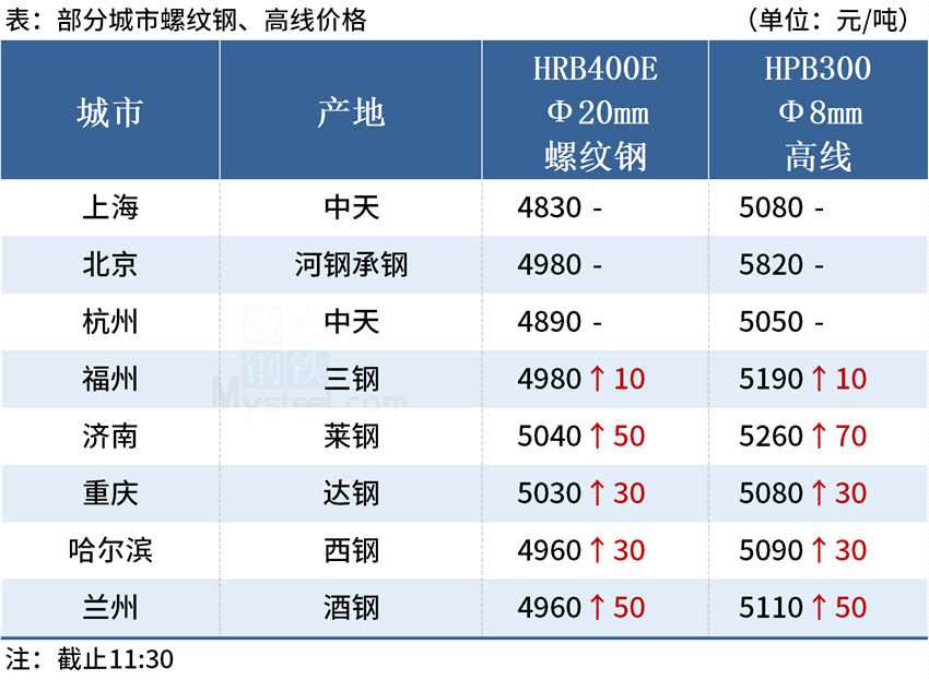 ◎濟南:9日早盤建材市場價格漲50-70。萊鋼螺紋4970,永鋒、石橫螺紋4960,永鋒、石橫盤螺5260。(單位:元/噸)