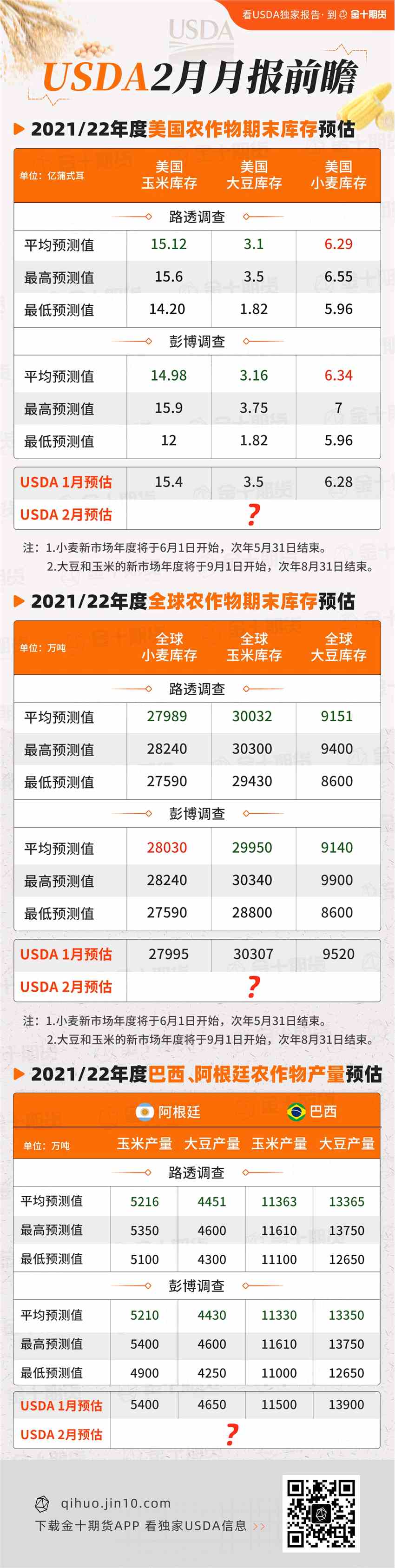 ?、?021/22年度美國玉米期末庫存將下調(diào),路透、彭博調(diào)查數(shù)據(jù)分別為15.12、14.98億蒲式耳,1月月報的預(yù)估為15.4億蒲式耳。