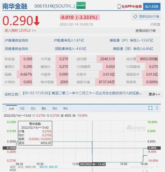 南華金融昨日一度跌停,收盤(pán)下跌超3%。財(cái)報(bào)顯示,南華金融2019年虧損77.57萬(wàn)港幣,2020年虧損268.23萬(wàn)港幣。