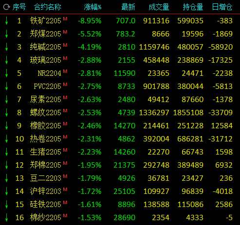 2月15日,國內(nèi)期貨早盤多數(shù)品種下跌。鐵礦主力合約跌近9%,動(dòng)力煤跌超5%,純堿跌超4%,玻璃、20號膠、螺紋、尿素、PVC、熱卷、橡膠、生豬跌超2%。漲幅方面,滬銀、乙二醇漲超2%。