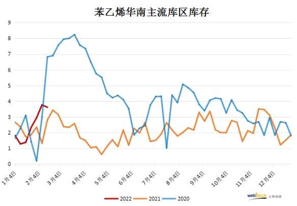 對比近些年華東、華南港口庫存,可知今年季節(jié)性累庫提前,庫存拐點(diǎn)或成后期支撐。從季節(jié)走勢圖觀察,苯乙烯港口庫存基本都經(jīng)歷一季度大幅累庫,二季度快速去庫,三、四季度庫存持穩(wěn)的趨勢(2020年受疫情影響除外)。而今年春節(jié)時(shí)間相對提前,導(dǎo)致累庫節(jié)點(diǎn)前移,短期之內(nèi)港口仍有部分船延期,到貨恢復(fù)進(jìn)度略高于提貨進(jìn)度。隨著下游需求不斷恢復(fù),港口提貨速度或有增強(qiáng),屆時(shí)庫存拐點(diǎn)的出現(xiàn)或成為后期支撐苯乙烯行情由弱轉(zhuǎn)強(qiáng)的契機(jī)。