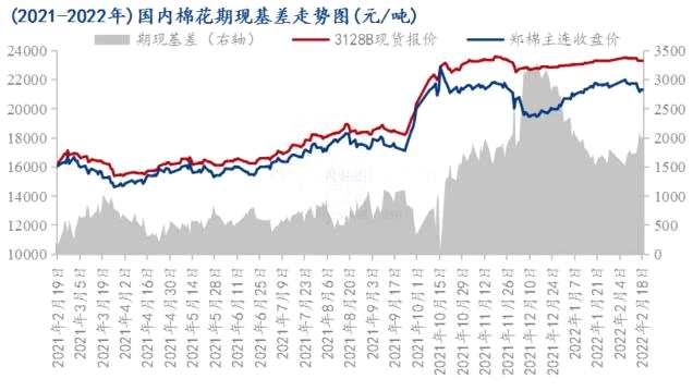 圖2(2021-2022年)國(guó)內(nèi)棉花期現(xiàn)基差走勢(shì)圖