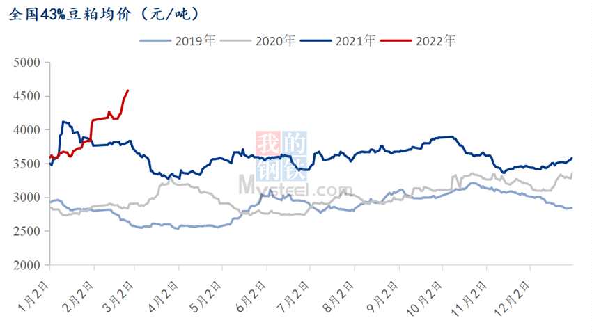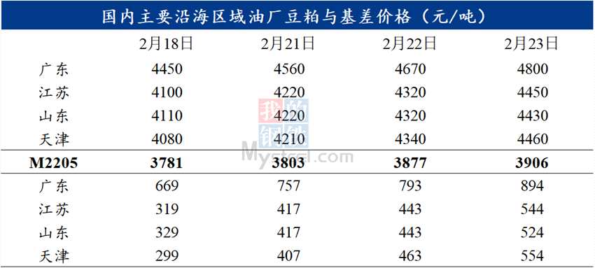 具體來看下表最近4個交易日豆粕期現(xiàn)貨價格,以沿海主要區(qū)域廣東、江蘇、山東、天津為例。出現(xiàn)豆粕現(xiàn)貨單邊價格與基差價格齊飛盛況,怎一“漲”’字了得?豆粕現(xiàn)貨價格每個交易日超100元/噸的速度飛奔。據(jù)Mysteel農(nóng)產(chǎn)品數(shù)據(jù)顯示,沿海主要區(qū)域2月18-2月22日現(xiàn)貨價格由4080-4450元/噸,漲至4430-4800元/噸,累計上漲350元/噸,累計漲幅7.87%-8.58%;現(xiàn)貨基差價格由299-699元/噸,漲至524-894元/噸,累計上漲195-225元/噸,累計漲幅2.79-7.53%。