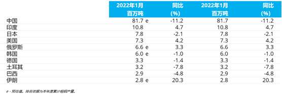 2022年1月粗鋼產(chǎn)量累計(jì)前十位的國(guó)家