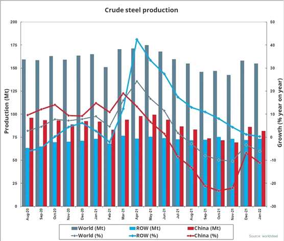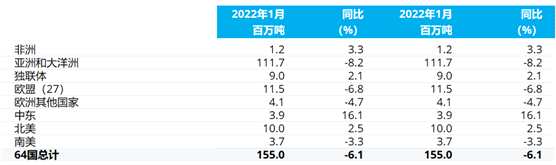 2022年1月全球64個(gè)納入世界鋼鐵協(xié)會(huì)統(tǒng)計(jì)國(guó)家的粗鋼產(chǎn)量為1.550億噸,同比下降6.1%。