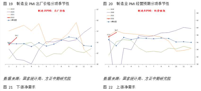 l制造業(yè)PMI其他分項(xiàng)方面。就業(yè)分項(xiàng)小幅回升0.3至49.2,經(jīng)濟(jì)下行帶來的就業(yè)壓力稍有緩解。供應(yīng)商配送上升0.6,疫情和春節(jié)影響減小后配送速度回升。在手訂單回落0.6至45.2,進(jìn)口和采購量分別上升1.4和0.7,也反映出節(jié)后短期加庫存特征。營業(yè)預(yù)期分項(xiàng)則繼續(xù)上升1.2。價(jià)格水平方面,原材料價(jià)格和出廠價(jià)格分別明顯上升3.6和3.2,跟隨2月大宗商品價(jià)格反彈繼續(xù)而走生。預(yù)計(jì)2月PPI環(huán)比將出現(xiàn)小幅正增長。