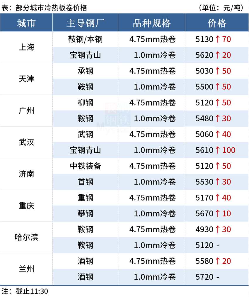 ◎武漢:2日早盤冷軋市場(chǎng)價(jià)格上漲50-100,1.0寶鋼青山卷5610,1.5卷5530,3.0卷6080。(單位:元/噸)