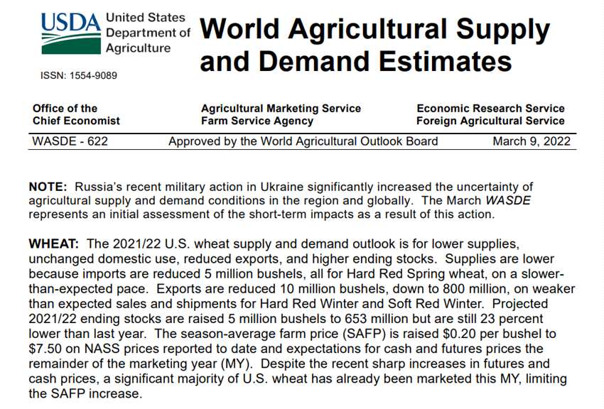摘要: (上海,編輯史正丞)當?shù)貢r間周三,美國農(nóng)業(yè)部發(fā)布月度全球農(nóng)業(yè)供需預測報告,數(shù)據(jù)顯示雖然東歐糧倉遭遇沖突停滯,但小麥短缺的情況并沒有市場擔憂得那么嚴重。(來源:美國農(nóng)業(yè)部)在最新報告中,