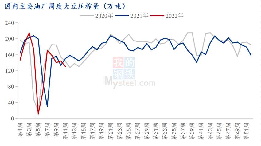 其四:油廠開機率連續(xù)四周下滑,豆粕供應(yīng)持續(xù)不足。受最近一個月來大豆到港量量不足的影響,疊加油廠大豆庫存本就處于低位,油廠開機率出現(xiàn)不斷下滑。據(jù)Mysteel農(nóng)產(chǎn)品數(shù)據(jù)顯示,國內(nèi)主要油廠周度大豆壓榨量從2月18日當周的170.78萬噸降至本周的130.24萬噸。作為對比,2017-2021年同期油廠周度大豆壓榨量為154萬噸。豆粕產(chǎn)出的持續(xù)減少,雖然下游消費不斷受到擠壓,但奈何短期仍是供應(yīng)端占據(jù)主要話語權(quán),令豆粕價格依舊不斷走高。