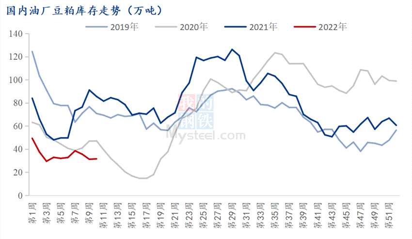 其七:豆粕庫存持續(xù)低位,令豆粕價格居高不下。春節(jié)至今,國內(nèi)主要油廠豆粕庫存持續(xù)處于低位水平,并未出現(xiàn)往年春節(jié)后的階段性累庫局面。據(jù)Mysteel農(nóng)產(chǎn)品數(shù)據(jù)顯示,豆粕最新庫存數(shù)據(jù)31.57萬噸,同比去年大幅減少54.02萬噸,減幅63.11%。此外,2017-2021年同期豆粕庫存數(shù)據(jù)均值為68.7萬噸。偏低的豆粕庫存,令上游廠家和中游貿(mào)易商對豆粕現(xiàn)貨價格挺價心態(tài)較濃。