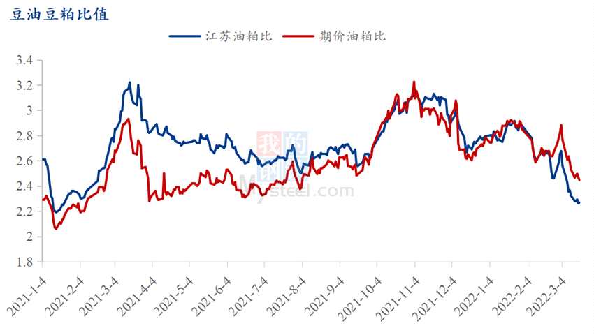 其六:3月份以來豆油價格見高回落,豆粕價格被動變得更加堅挺。3月初,豆粕期現(xiàn)貨價格雙雙創(chuàng)出階段性高位后出現(xiàn)一輪回撤走勢。從下圖油粕比走勢來看,2022年3月3日,江蘇地區(qū)現(xiàn)貨豆油豆粕比值2.68,期價主力合約豆油豆粕比值2.88;截止3月18日,江蘇地區(qū)現(xiàn)貨豆油豆粕比值下降至2.27,期價主力合約豆油豆粕比值下降至2.44。期間外圍CBOT大豆價格整體高位盤整為主,因此豆粕估值獲得被動提升。