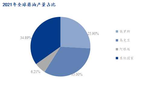 俄羅斯農(nóng)業(yè)資源豐富,擁有全球10%的可耕地(約4億公頃),其中優(yōu)良肥沃的黑土占世界黑土的55%,面積廣闊、土地肥沃,具有發(fā)展農(nóng)業(yè)的優(yōu)良條件。但受到氣候的影響,俄羅斯主要農(nóng)作物以谷類作物,向日葵、玉米、大米為主,其中向日葵是其主要的油料作物種植。2021年俄羅斯葵花籽油產(chǎn)量549.3萬(wàn)噸,相比2020年葵油產(chǎn)量增加35.2萬(wàn)噸,增幅6.84%。2021年葵油產(chǎn)量占全球產(chǎn)量的25.9%。