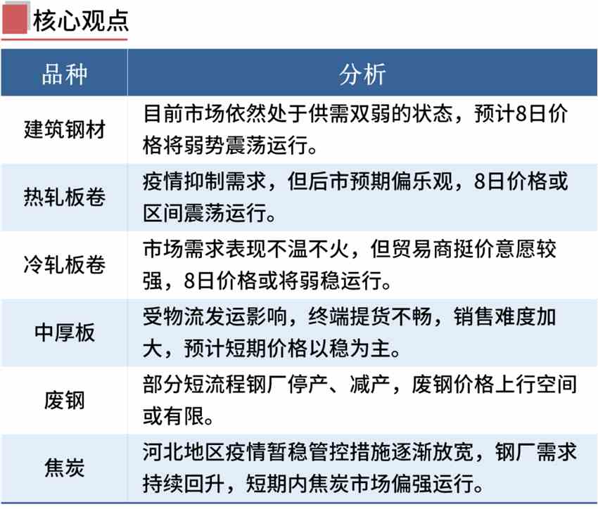 建筑鋼材:4月7日,全國31個主要城市20mm三級抗震螺紋鋼均價5157元/噸,較上個交易日下跌12元/噸。本周產(chǎn)量較上周有一定增長。就華東地區(qū)而言,疫情帶來的交通管制仍影響著廢鋼以及煉鐵原料的運輸。庫存方面來看,本周廠庫環(huán)比增長較多,受疫情影響交通受阻,鋼廠發(fā)貨困難,加上恰逢清明假期,鋼廠庫存進(jìn)一步累積。需求方面來看,當(dāng)前需求依舊處于較弱水平,疊加假期影響,本周下游消費量有所減少,貿(mào)易商拿貨積極性降低。總體來看,目前市場依然處于供需雙弱的狀態(tài),預(yù)期對現(xiàn)實價格的影響已逐步減弱,預(yù)計8日國內(nèi)建筑鋼材價格或?qū)⒀永m(xù)弱勢震蕩運行。