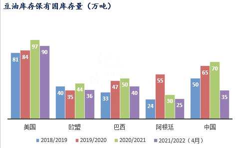 根據(jù)USDA4月最新供需報(bào)告顯示,全球豆油年末庫存大約為350萬噸至470萬噸,主要庫存保有國從多到少依次是:美國、中國、巴西、歐盟和阿根廷,整體來看,2021/22年度幾大庫存保有國庫存總量較2020/21年度有減少可能,但根據(jù)3月供需平衡報(bào)告來看,二者比較我們發(fā)現(xiàn),除中國外,其余幾大庫存保有國庫存都有增加現(xiàn)象,也就是說,期末庫存維持低位固然是利好,但4月報(bào)告顯示利好程度有所減少。