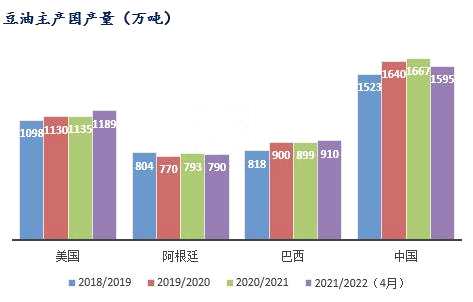 先從全球豆油產(chǎn)量說起,自2017年以來,全球豆油年度總產(chǎn)量5500萬噸至6050萬噸。主產(chǎn)國產(chǎn)量從多到少依次是:中國、美國、巴西和阿根廷。那么根據(jù)USDA4月最新供需報(bào)告顯示,2021/22年度,中國豆油產(chǎn)量1595萬噸,較上月預(yù)估調(diào)減54萬噸;美國產(chǎn)量1189萬噸,較上月預(yù)估持平;巴西產(chǎn)量910萬噸,較上月預(yù)估調(diào)增20萬噸;阿根廷產(chǎn)量790萬噸,較上月預(yù)估持平,由上圖我們可以清晰看到,美國豆油產(chǎn)量這幾年穩(wěn)步提升,而巴、阿產(chǎn)量則基本維持在800-900萬噸一線窄幅波動(dòng),中國最新年度則比較特殊,產(chǎn)量銳減。