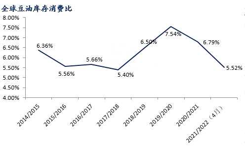 根據(jù)USDA4月最新供需報(bào)告顯示,全球豆油庫銷比由2019/2020年度的7.54%下降到2020/2021年度的6.79%,而2021/2022年度,目前美國農(nóng)業(yè)部預(yù)計(jì)全球豆油庫銷比為5.52%,較上月整體變化有限。