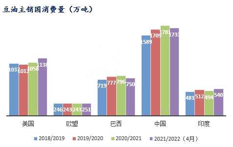 全球豆油年度消費(fèi)量5400萬噸至6050萬噸,主要消費(fèi)國消費(fèi)量從多到少依次是中國、美國、巴西、印度和歐盟。根據(jù)USDA4月最新供需報(bào)告顯示,預(yù)計(jì)2021/22年度,中國豆油消費(fèi)量1733萬噸,較上月預(yù)估調(diào)減41萬噸;美國消費(fèi)量1138萬噸,較上月預(yù)估持平;巴西消費(fèi)量750萬噸,與上月預(yù)估持平;印度消費(fèi)量540萬噸,較上月預(yù)估調(diào)增10萬噸;歐盟消費(fèi)量251萬噸,較上月預(yù)估持平。消費(fèi)前五國除巴西、中國外,消費(fèi)量進(jìn)幾年都是穩(wěn)步提升,對國際豆油價(jià)格形成支撐.