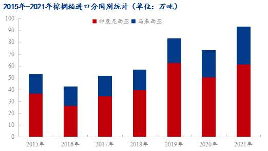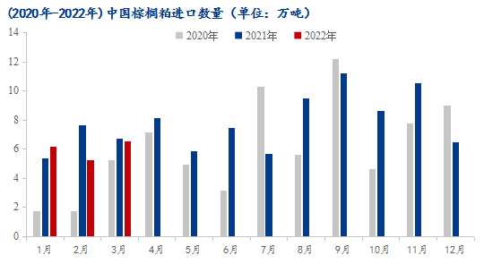 據(jù)海關(guān)總署公布的數(shù)據(jù)顯示:2022年3月國(guó)內(nèi)棕櫚粕進(jìn)口量6.57萬(wàn)噸,較2022年2月份增加1.31萬(wàn)噸,環(huán)比增加25.01%;較2021年3月減少0.14萬(wàn)噸,同比減少2.05%。其中3月份進(jìn)口均價(jià)為225.05美元/噸。截至2022年1-3月國(guó)內(nèi)棕櫚粕進(jìn)口累計(jì)18.01萬(wàn)噸,較去年同期19.96萬(wàn)噸減少1.75萬(wàn)噸。