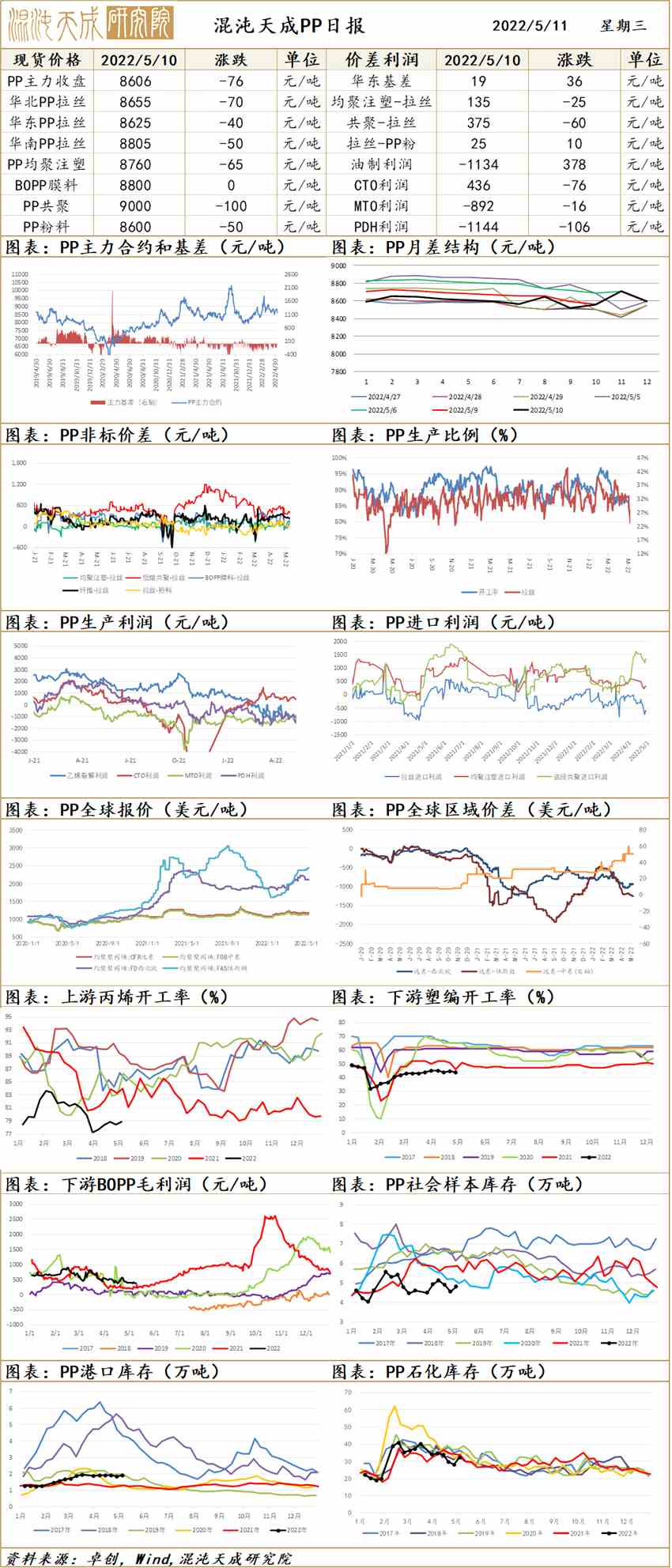 需求端:塑編開工率44%較上周下滑0.5%。注塑開工率55%較上周持平。BOPP開工率61.2%較上周下降1%。PP管材開工率45.6%較上周下跌0.6%。膠帶母卷開工率52.7%較上周持平。無紡布開工率60%較較上周持平。CPP開工率41%較上周持平。整體平均開工率51.7%較較上周下跌0.3%,同比往年同期下滑5%。