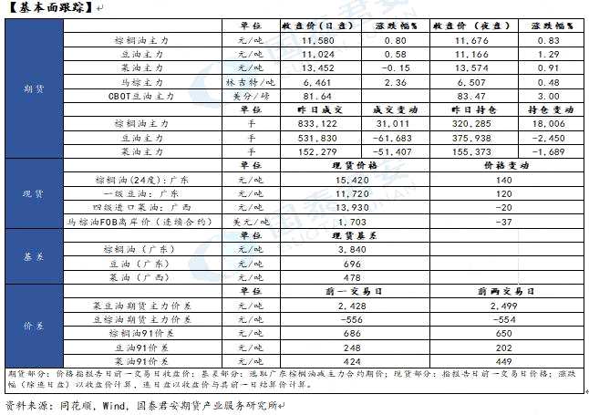 豆油方面,隨著大豆壓榨量回升,國內(nèi)豆油庫存回升,國內(nèi)市場終端逢低采購現(xiàn)象增加,現(xiàn)貨基差穩(wěn)中走強(qiáng)。預(yù)計(jì)短線豆油期價(jià)繼續(xù)跟隨棕櫚及外盤豆類走勢,關(guān)注今晚USDA月度供需報(bào)告,及報(bào)告后CBOT大豆和CBOT豆油的走勢。