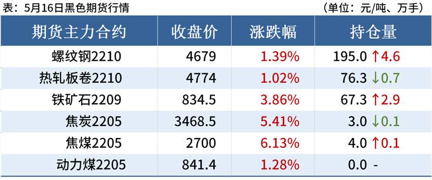 焦炭:5月16日,焦炭市場偏弱運行,焦炭市場二輪降價落地,累計降幅為400元/噸。產(chǎn)地焦企開工正常,生產(chǎn)良好,當前焦企仍有盈利即產(chǎn)即銷,出貨順暢。鋼廠方面,鋼廠焦炭庫存呈現(xiàn)增勢,現(xiàn)大多控制到貨節(jié)奏,按需采購焦炭,考慮到鋼廠成品出貨壓力較大且原料成本依然偏高,繼續(xù)打壓焦價意愿強烈。原料煤價格繼續(xù)回落,成本支撐較弱,預(yù)計短期內(nèi)焦炭市場偏弱運行。