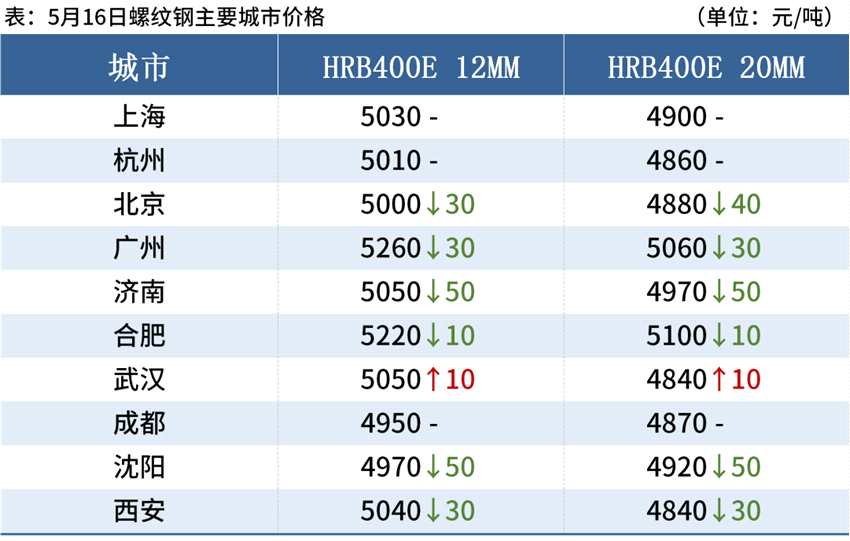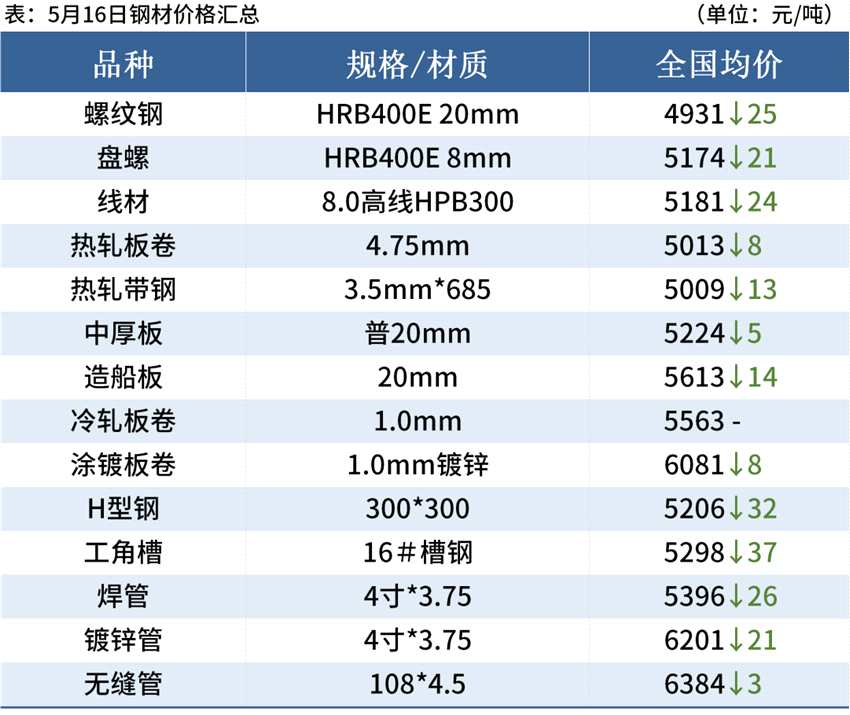 摘要: 一、鋼材期現(xiàn)市場價格5月16日,國內(nèi)鋼材市場價格延續(xù)跌勢,唐山普方坯出廠價格持穩(wěn),報4580元/噸。上周末唐山鋼坯累跌80元/噸,16日市場心態(tài)整體偏悲觀,商家積極出貨,成交表現(xiàn)一般。
