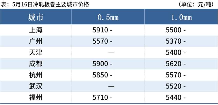 冷軋板卷:5月16日,全國24個主要城市1.0mm冷卷均價5563元/噸,較上個交易日持平。熱卷期貨盤面震蕩運行,市場大多持穩(wěn)報價,上海地區(qū)仍處管控狀態(tài),部分倉庫可以加工和提貨,但在高庫存的壓力下,市場信心不足。鋼廠方面,今日首鋼出臺6月份訂貨政策,其中冷軋板卷基價較上一期下調(diào)100元/噸。市場心態(tài)依舊偏謹慎悲觀,現(xiàn)貨挺價不力,預(yù)計17日國內(nèi)冷軋板卷價格以穩(wěn)為主。