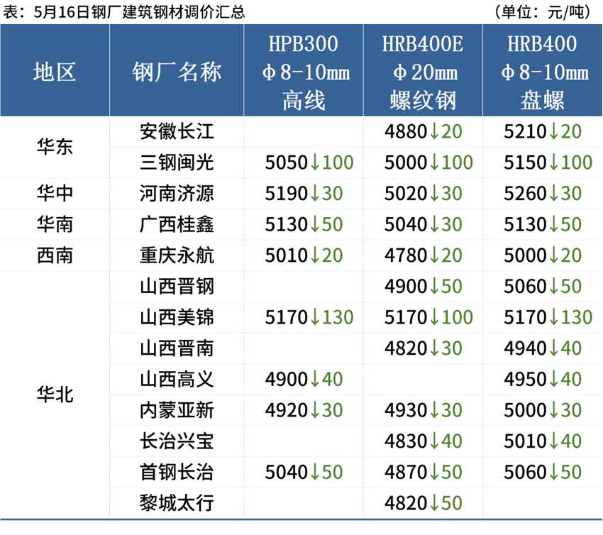 16日,13家鋼廠下調(diào)了建筑鋼材出廠價格20-130元/噸。