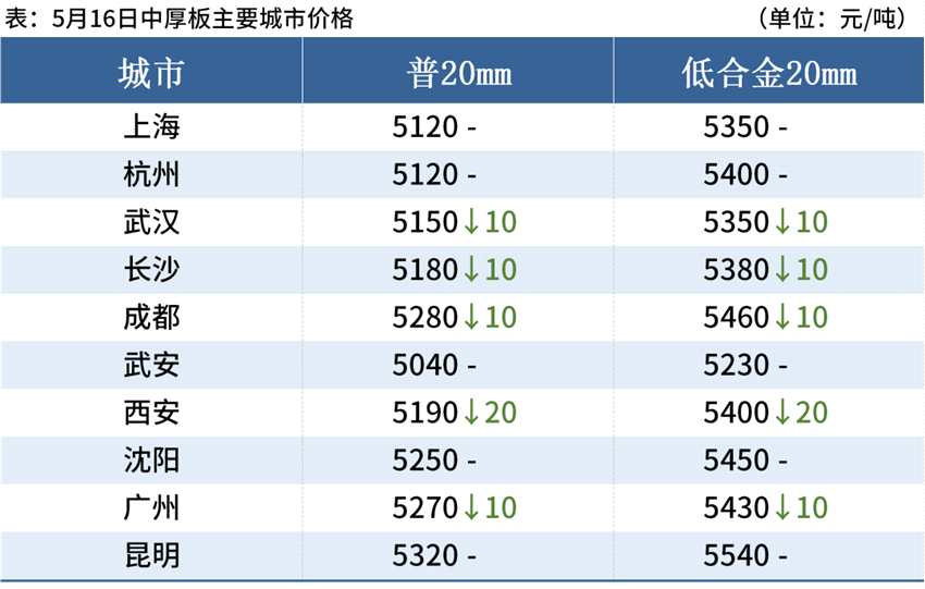 中厚板:5月16日,全國24個主要城市20mm普板均價5224元/噸,較上個交易日下跌5元/噸。今日開市,期貨震蕩偏強運行,現(xiàn)貨穩(wěn)中趨弱,供應(yīng)層面,上周中板產(chǎn)量小幅下降,但仍處于偏高水平。流通環(huán)節(jié),北方資源南下再度受阻,廠庫有進一步累積趨勢。需求方面,上周市場成交明顯下滑,下游節(jié)后補庫完成,拿貨積極性減弱。綜合來看,預(yù)計17日中厚板價格維穩(wěn)運行。