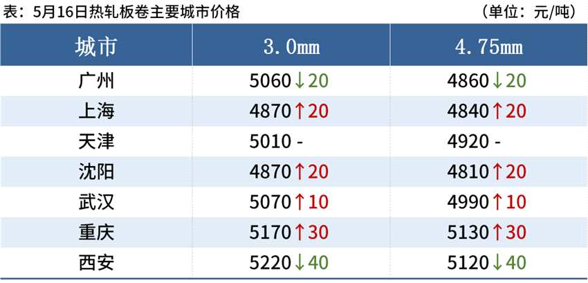熱軋板卷:5月16日,全國24個主要城市4.75mm熱軋板卷均價5013元/噸,較上個交易日下跌8元/噸。受期貨盤面的影響午后價格小幅上揚,但成交普遍一般,看弱情緒仍在部分蔓延,商家多數(shù)仍謹慎操作,預(yù)計17日全國熱軋板卷價格將呈現(xiàn)小幅上漲的態(tài)勢。